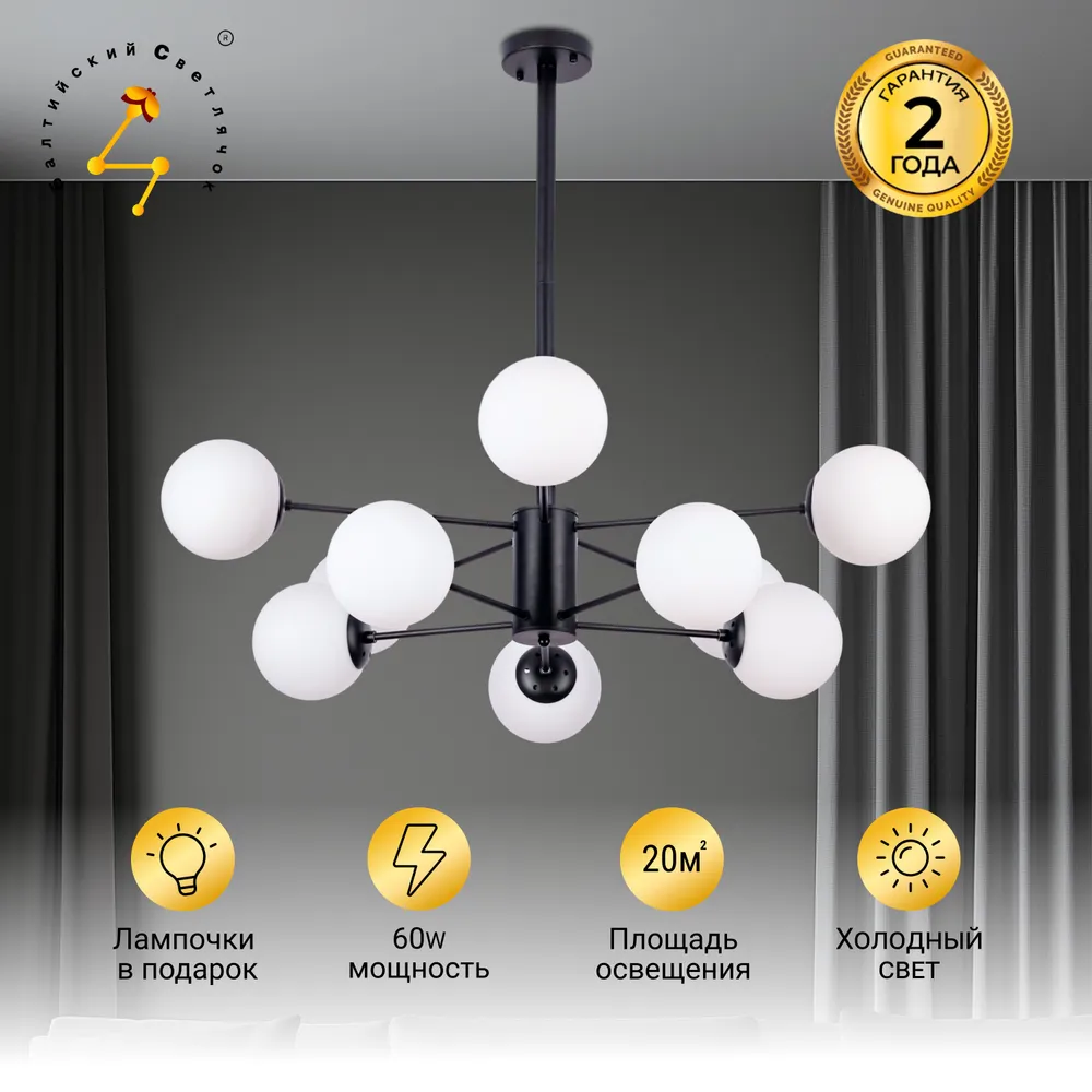 Люстра Балтийский Светлячок потолочная с 10 плафонами, скандинавский стиль, для зала, кухни и гостиной, белая/золотая