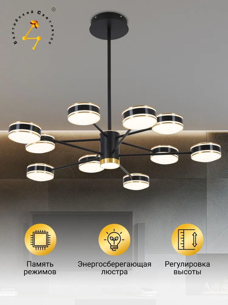 Светодиодная люстра Балтийский Светлячок, 53 Вт, 11 ламп, диммирование, 3 режима, черная. Для кухни, спальни, гостиной