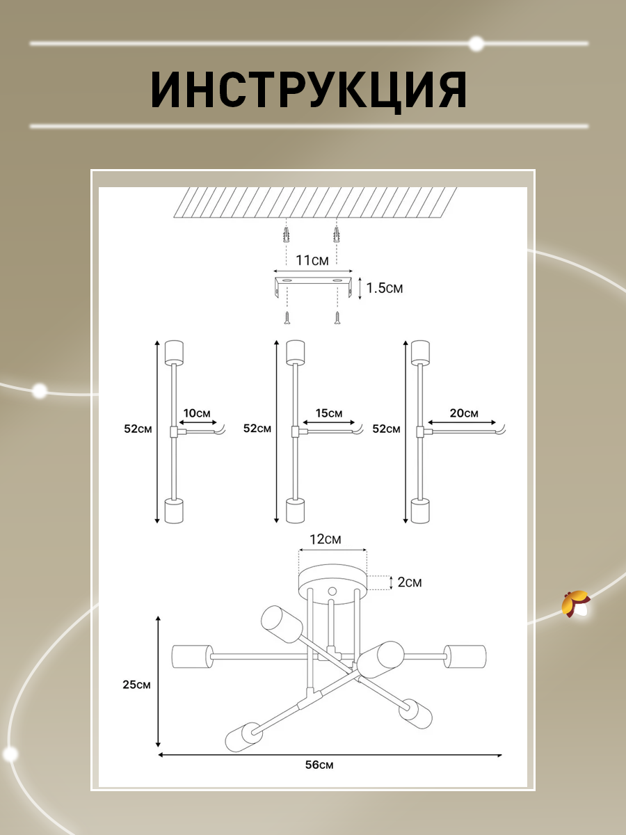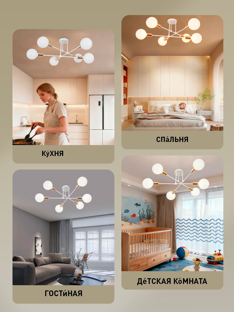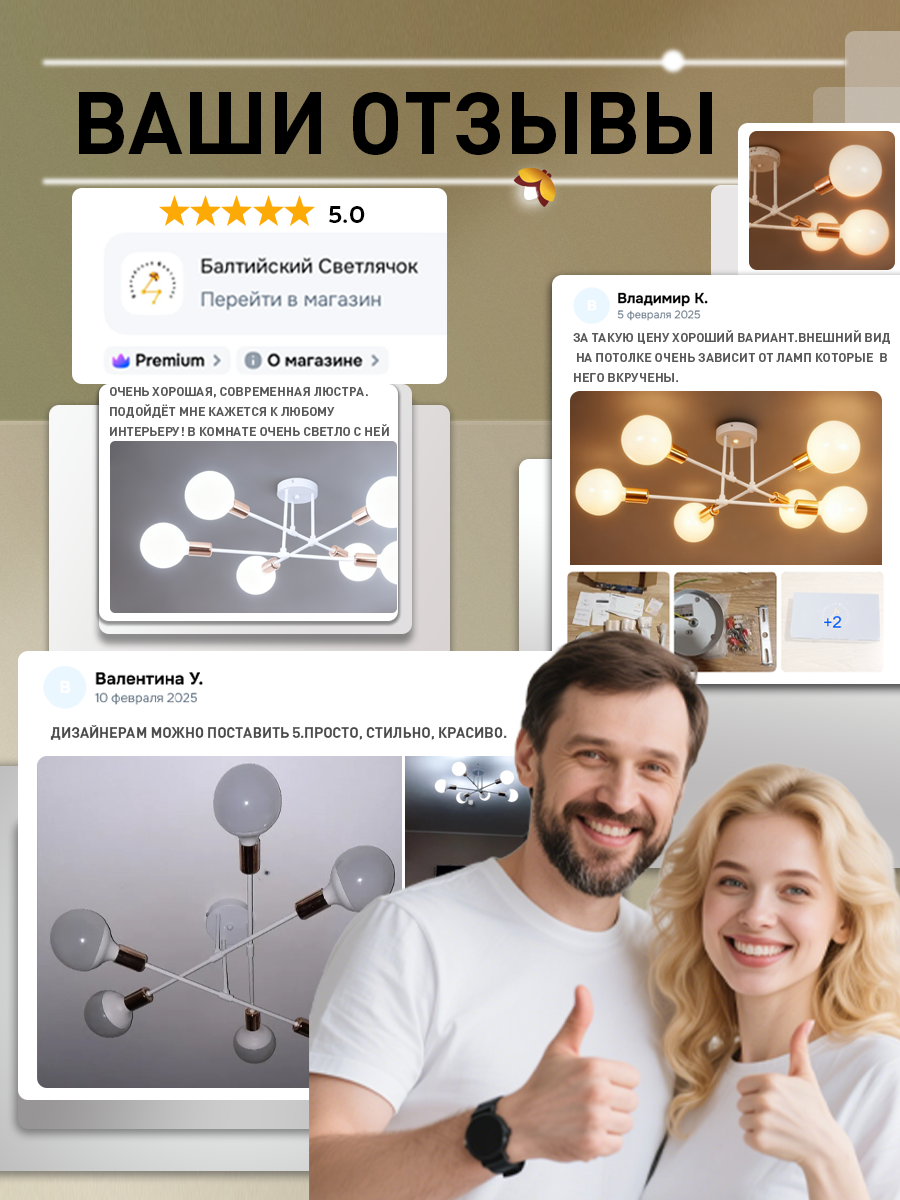 Люстра потолочная Балтийский Светлячок в скандинавском стиле для гостиной 6 рожков без плафонов
