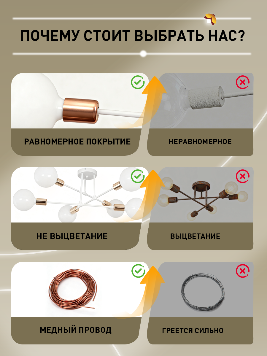Уважаемый покупатели! Плафоны не предусмотрены конструкцией люстры! Потолочная люстра в стиле лофт рассчитана на 6 ламп, подойдет для спальни, на кухню, в прихожую. Отлично освещение для дома: в прихожую, гостиную, подойдет для зала, в коридор. В детскую комнату для подростка мальчика или девочки. В светильнике могут быть использованы лампочки накаливания, энергосберегающие лампы или ретро лампы с цоколем е27. Допускается подвеска светодиодной люстры ко всем типам потолков, в т.ч. натяжному, навесному потолку. Площадь освещения – до 25 м2. Светильник крепится при помощи потолочной планки. Отсутствие плафонов является преимуществом, т.к. оно обуславливает беспрепятственное рассеивание света. Кроме того, эта люстра светодиодная на потолок выполнена из высококачественного металла и имеет прочную и надежную конструкцию, что делает ее долговечной и надежной. Гарантия светильника без ламп: 2 года. В ассортименте нашего магазина вы можете найти настенные светодиодные светильники. Светодиодные led люстры. Прикроватные бра. Люстры лед с пультом в любую комнату. Освещение в дом, для дачи.