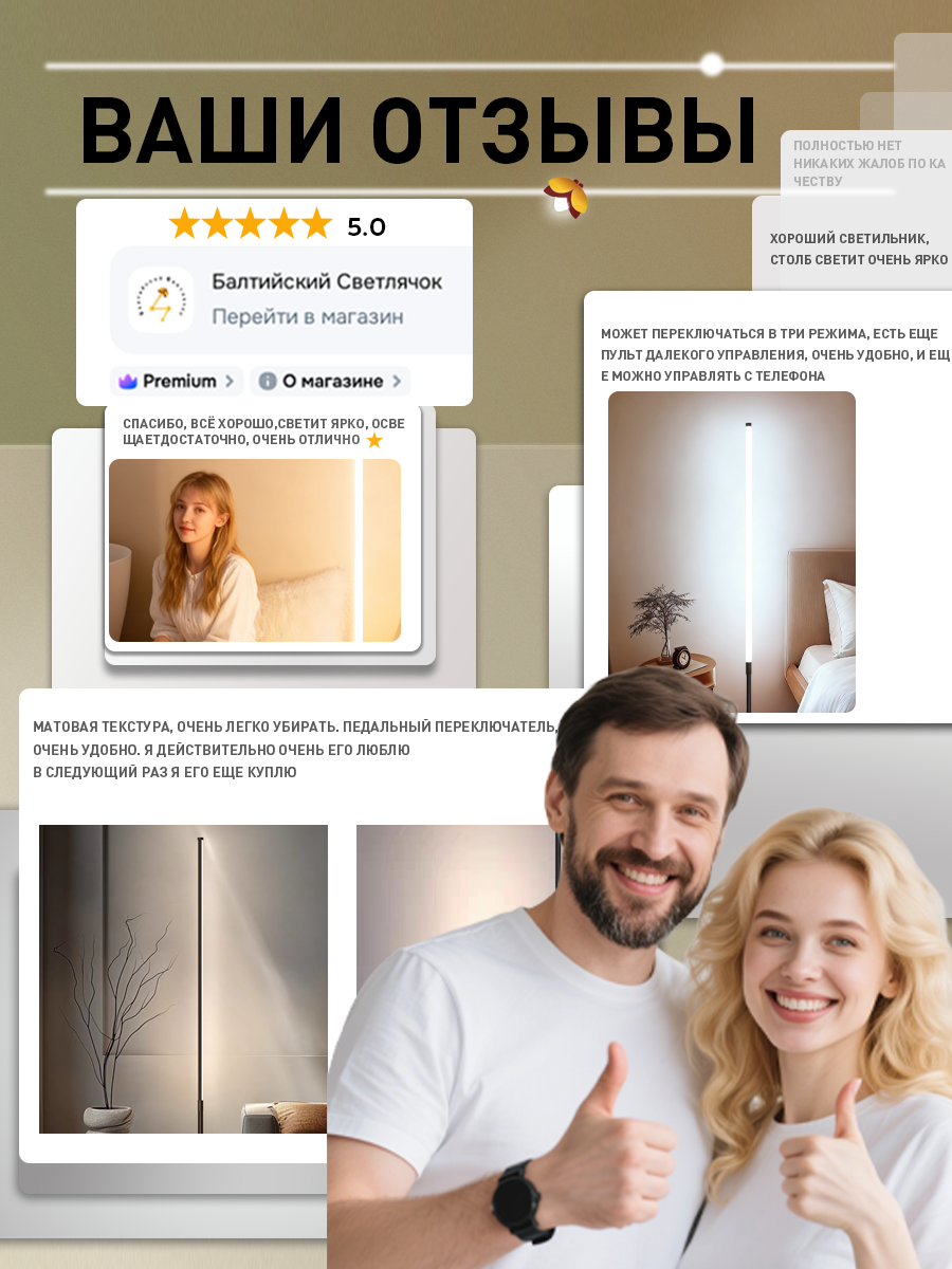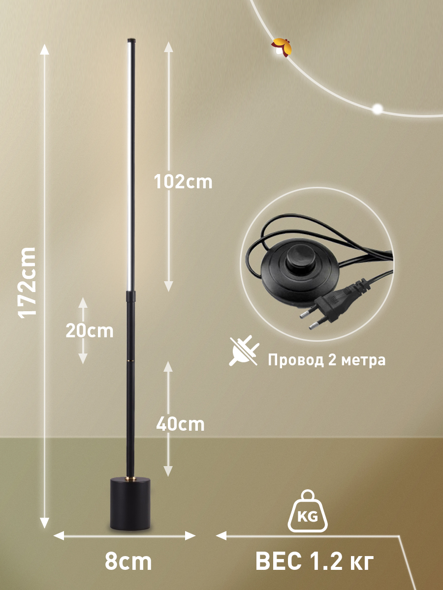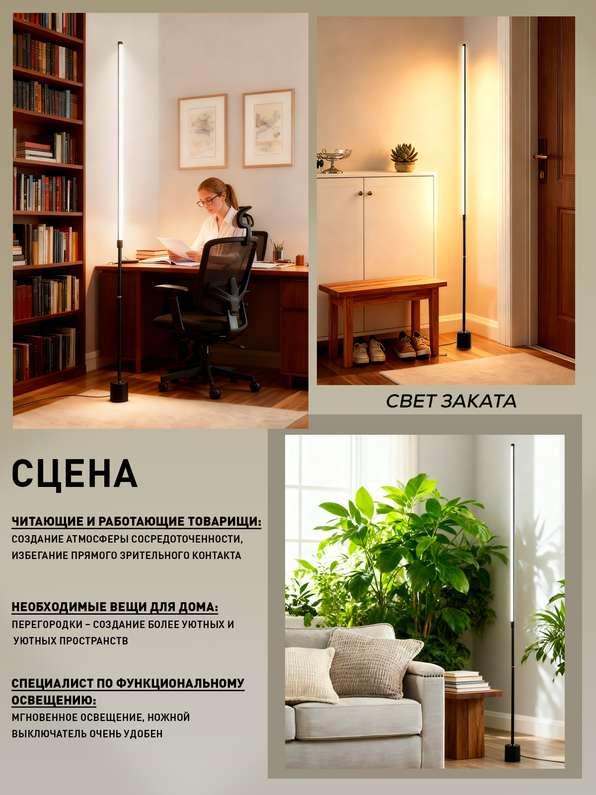 Здравствуйте! Этот элегантный чёрный торшер “Baltic Firefly” идеально сочетает в себе мощное светодиодное освещение и мягкий ночник. Чтобы включить свет, просто нажмите на педаль. Он идеально подходит для создания тёплой атмосферы в спальне, служит безопасным ночником в детской комнате или дополнит интерьер гостиной современным декоративным элементом. Этот торшер гармонично впишется в любой современный интерьер.