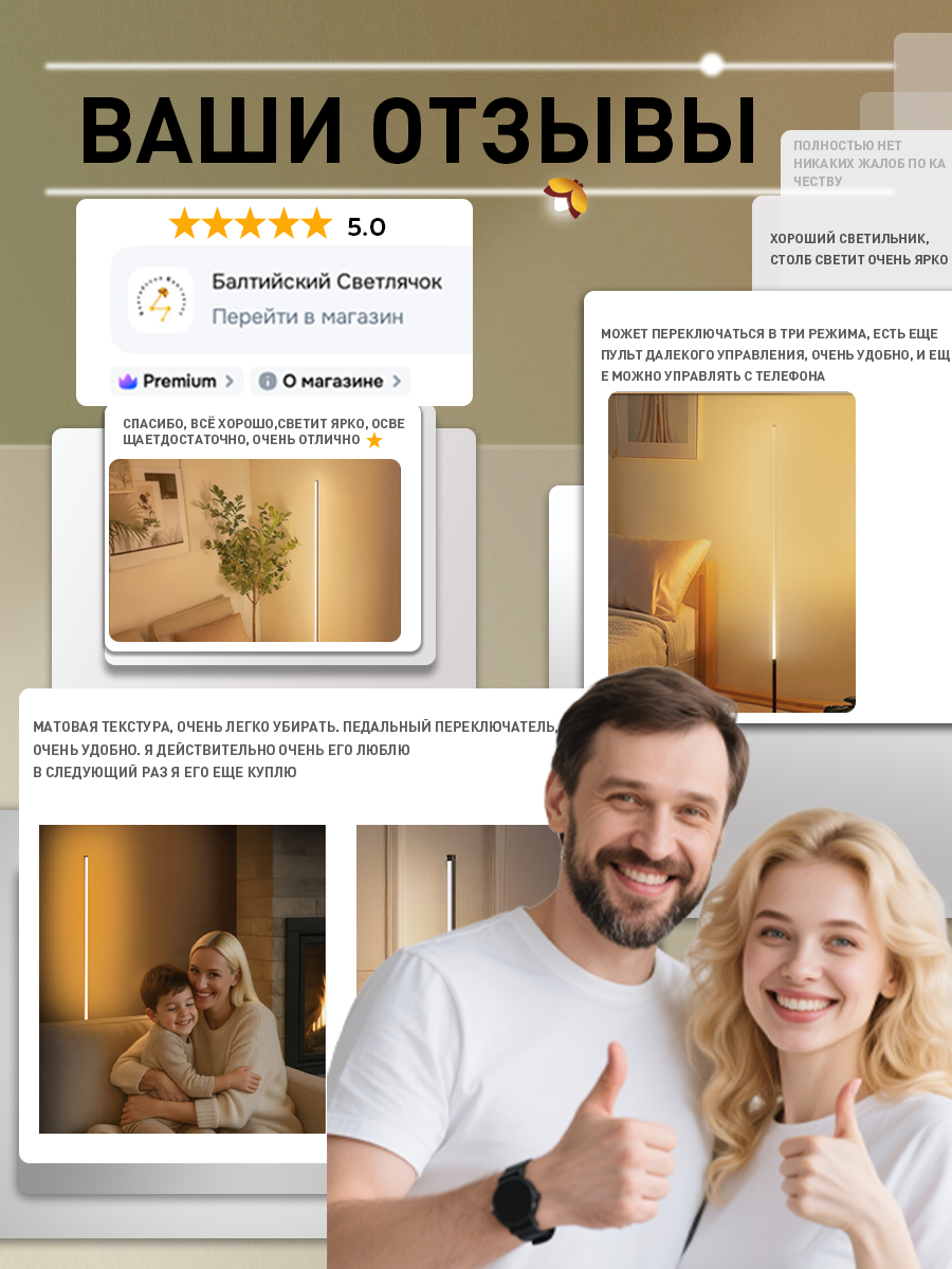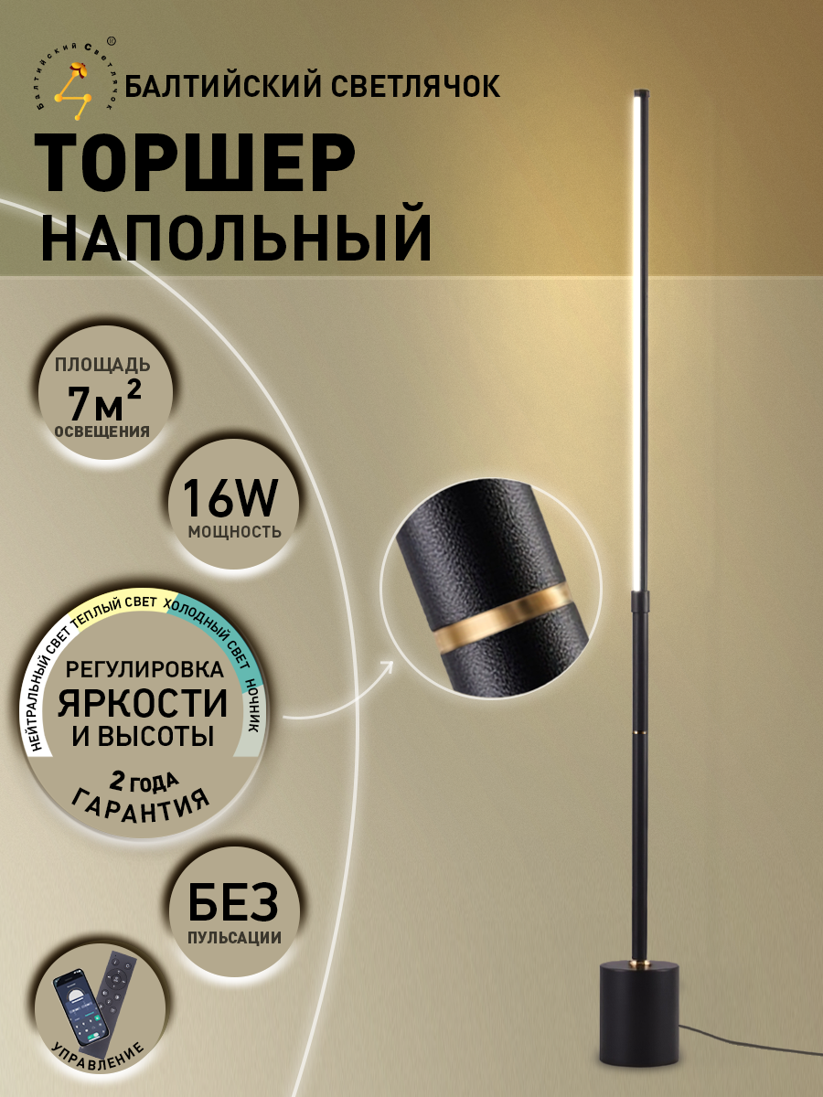 Балтийский Светлячок Высокий Напольный Светильник-Торшер 172 см с Пультом ДУ, Управлением через Смартфон и Педалью, 3 Режима Освещения, для Гостиной, Спальни, Ночник